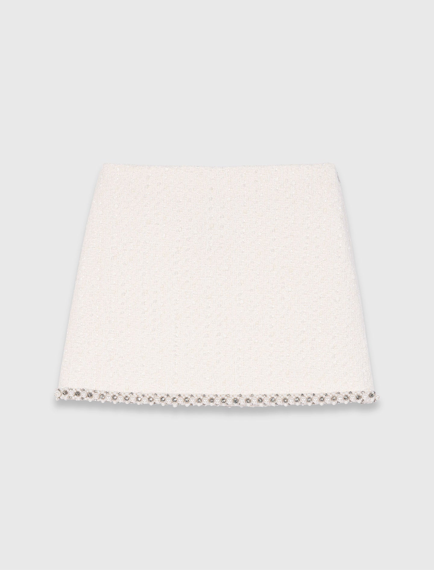 إطلالة واثقة وتفاصيل راقية: تنورة A-line بتأثير التويد بلون البيج الفاتح، قطعة مميزة تجمع بين الأناقة الباريسية والتألق العصري. تُبرز قصتها القصيرة نسيج التويد الغني، بينما يُضفي شريط من الجواهر البراقة لمسةً من التألق على الحافة، كاشفةً عن تباين أنيق بين اللمعة واللمعان.